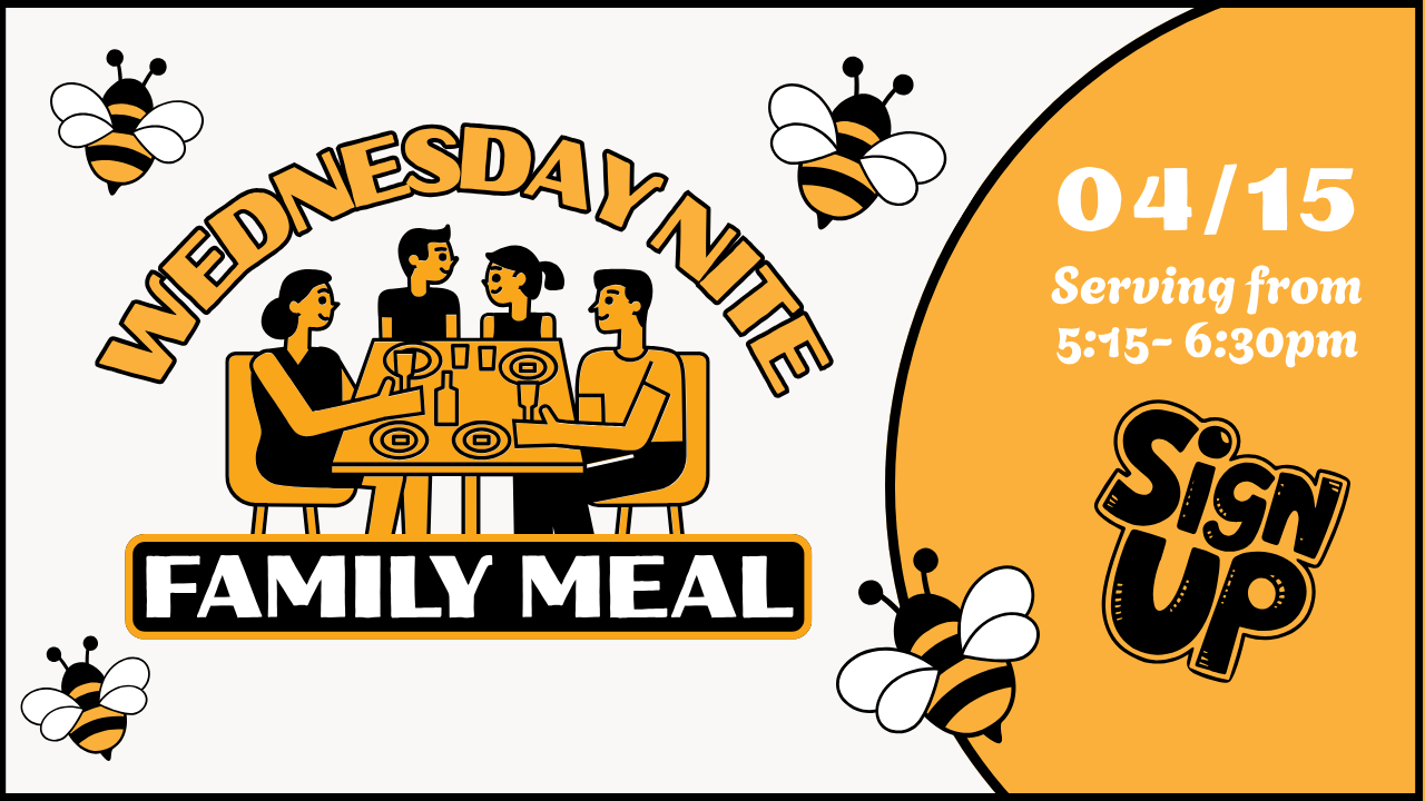 It’s our Wednesday Night Family Meal season finale, and you won’t want to miss it! We’ve got surprises, smiles, and a little bit of chaos for all ages. Kids, you thought last week’s egg hunt was fun? Let’s just say… the fun continues! Bring your family, bring a friend… and don’t just eat and run! Sign up now—or you’ll bee sorry.